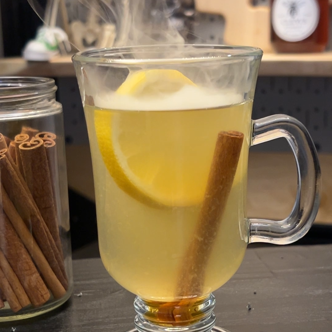 Whiskey, honey, fresh lemon, and warm water are combined and gently smoked for a cozy, aromatic sip. Finished with a lemon wheel and cinnamon stick, it’s soothing, warming, and elegantly smoky.
